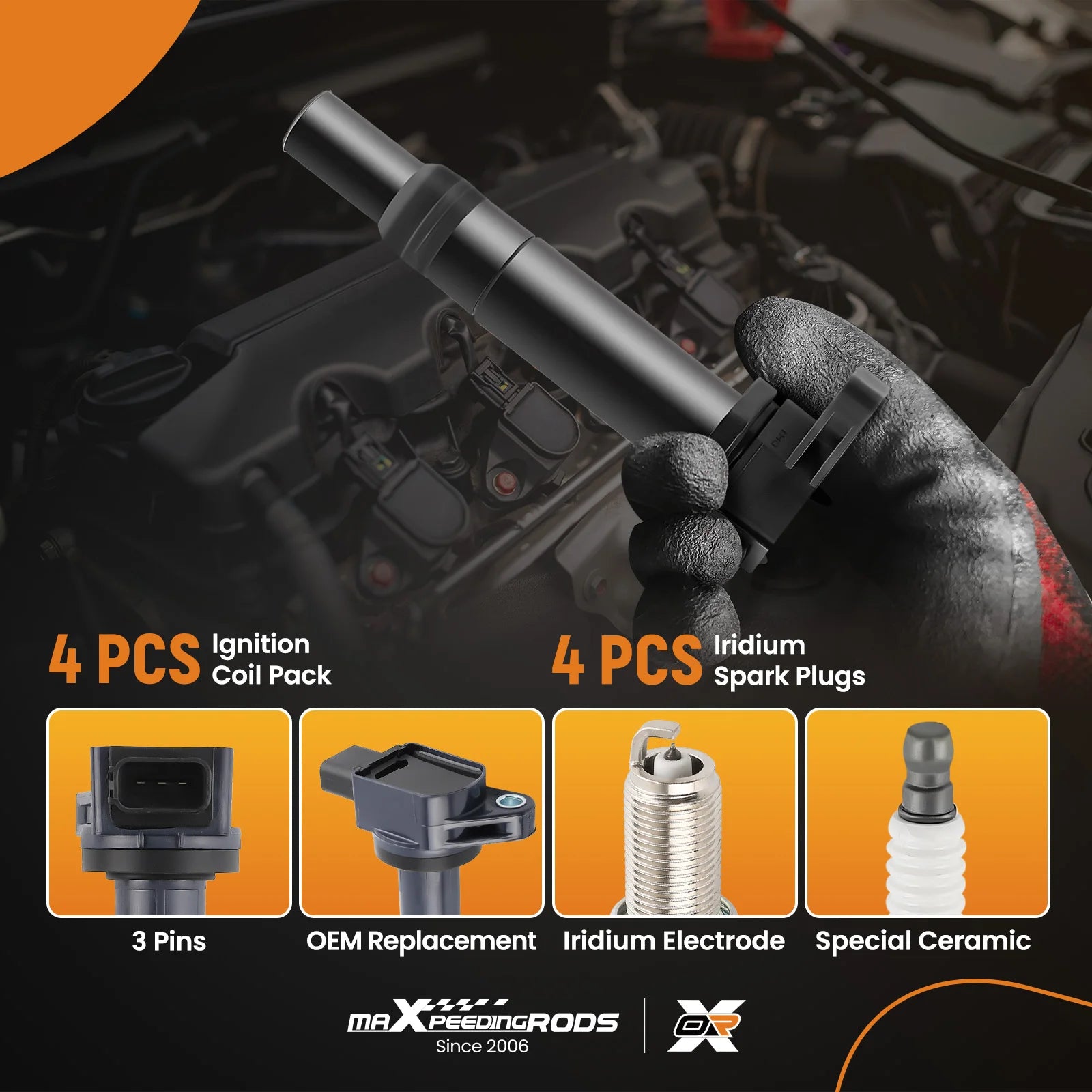 - Four-coil and plug package: Includes four ignition coils and iridium spark plugs (IZFR6K11) for reliable ignition and efficient combustion.