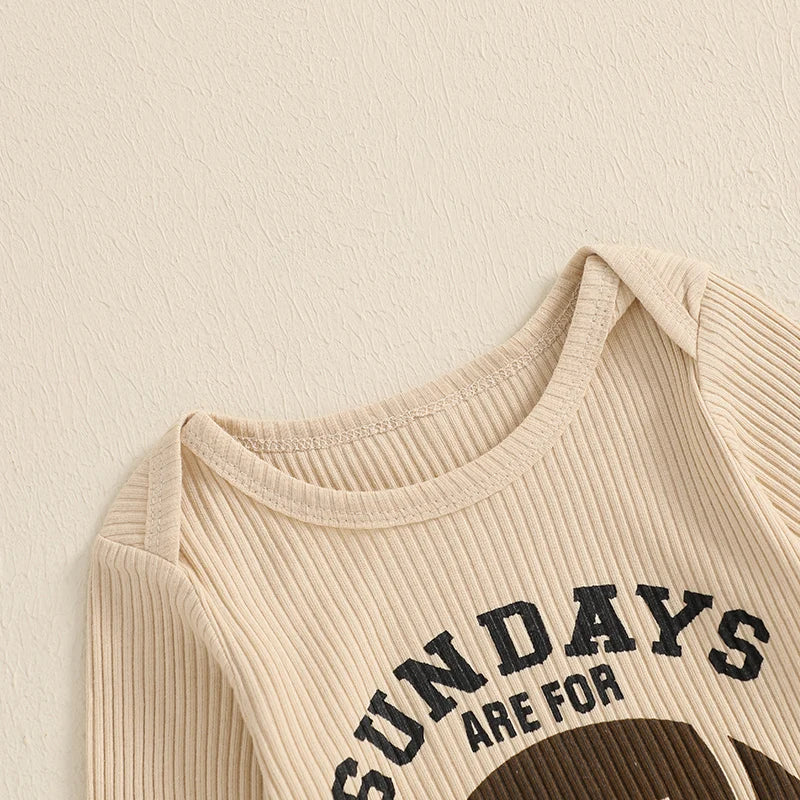 This long-sleeve, ribbed jumpsuit pairs a classic rugby letter print with soft polyester-blend fabric and a matching hat, creating a complete outfit that’s perfect for everyday wear, playdates, or family photos. The neutral, gender-neutral design makes it a versatile choice for gifting or mixing into any little one’s wardrobe.
