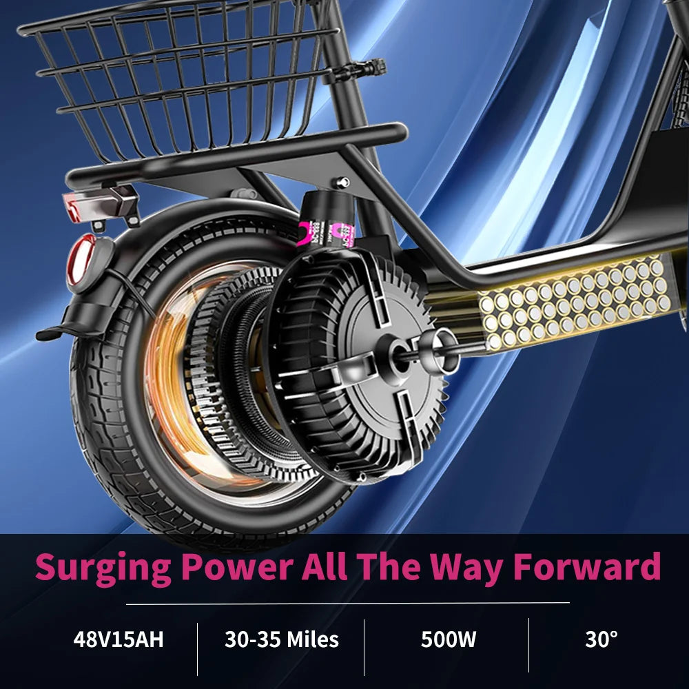 - Powerful performance with a 500W motor delivers steady acceleration and reliable hill-climbing support up to 30–50 km/h, helping you navigate city streets and ramp up your daily errands.
