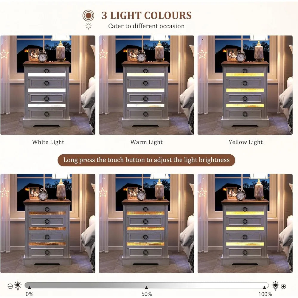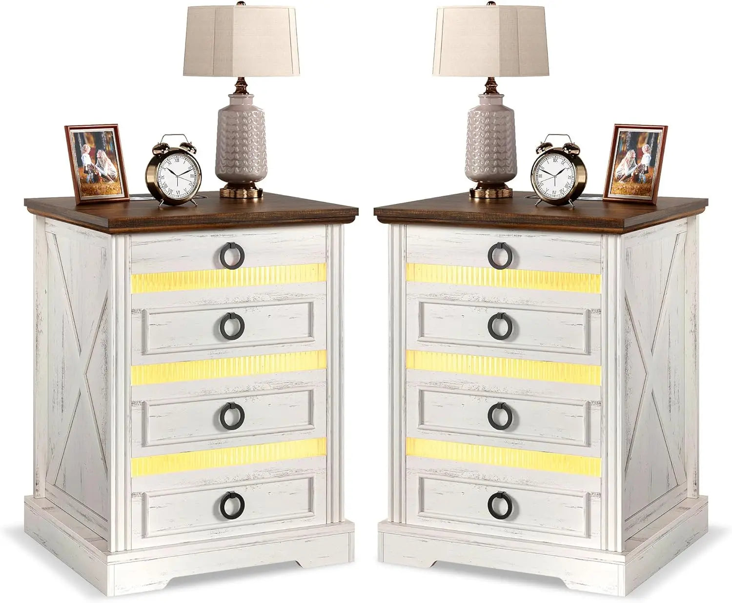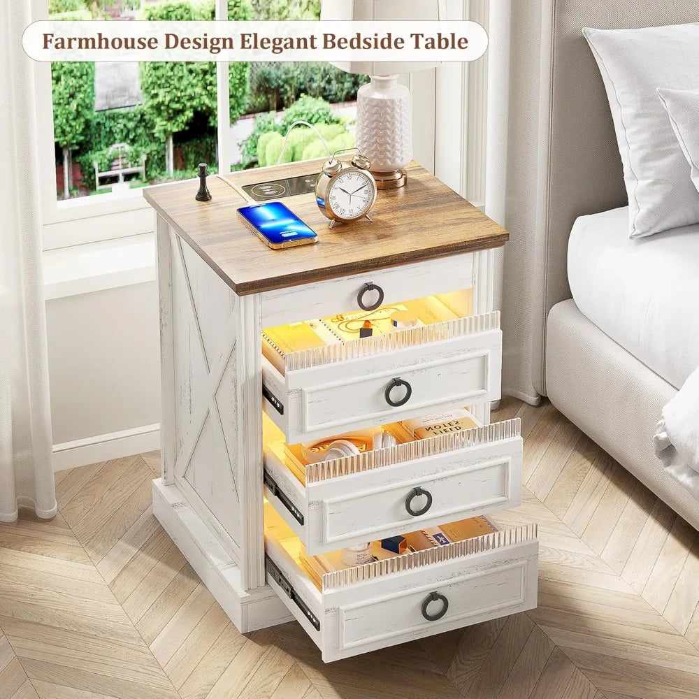 Farmhouse Night Stand with Gun Drawer Bedside Table with Charger Station LED Nightstand with Human Sensor Light Smart End Tab