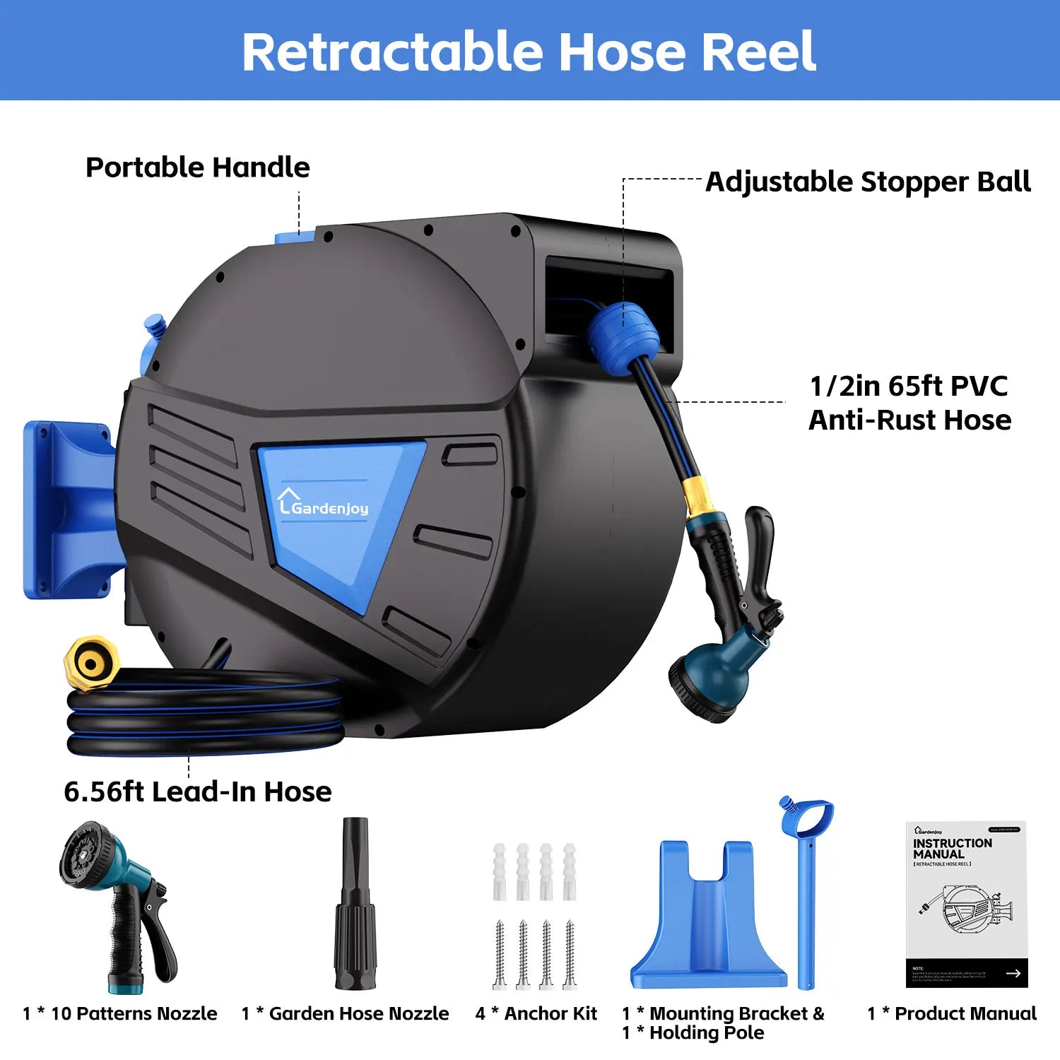 GardenJoy Retractable Hose Reel 65ft Wall Mounted With Locking Mechanism