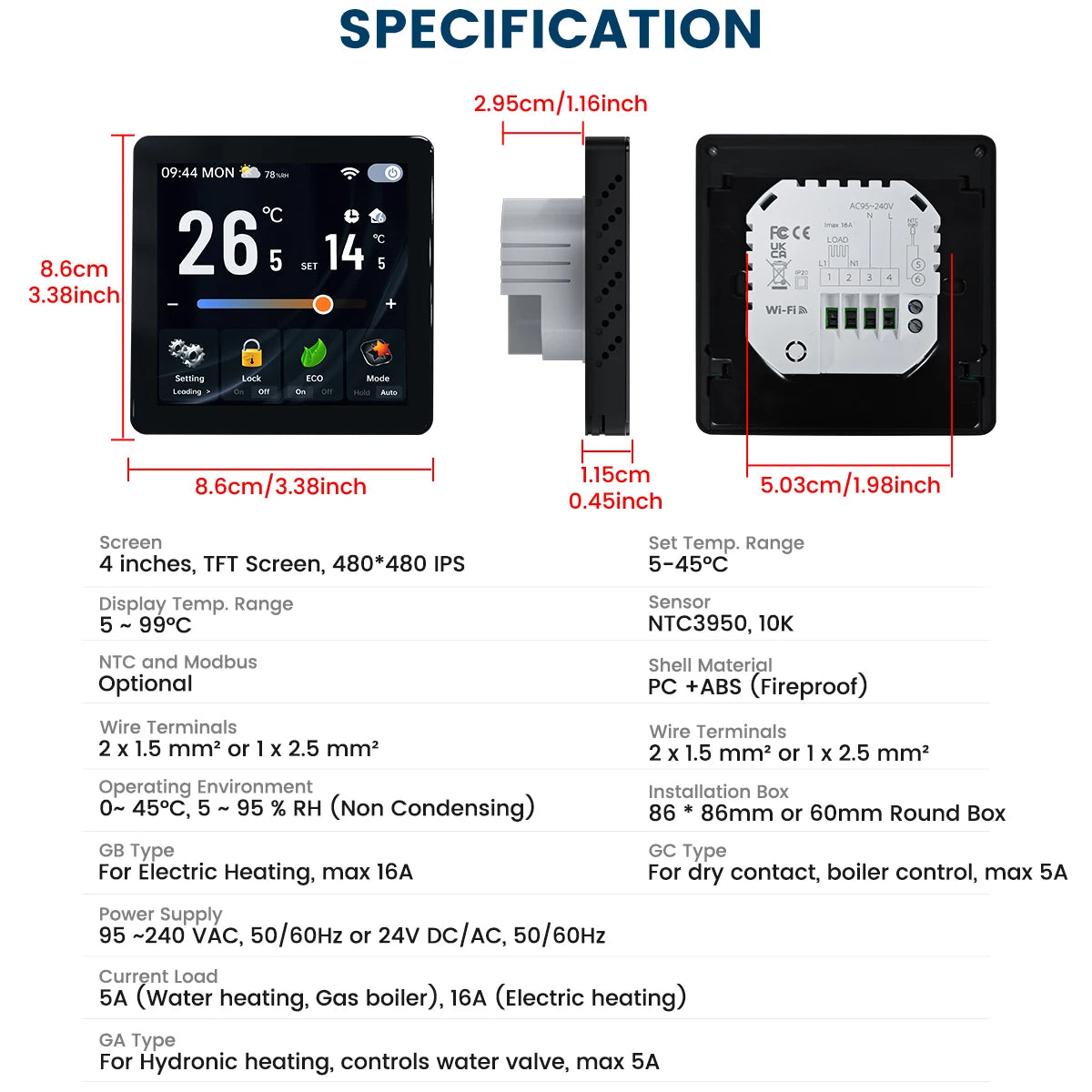 - 4-inch TFT display (480x480) shows 5–99°C with a 5–45°C adjustable setpoint; uses the NTC3950 10K sensor and fits 86×86 mm square or 60 mm round installation boxes.
