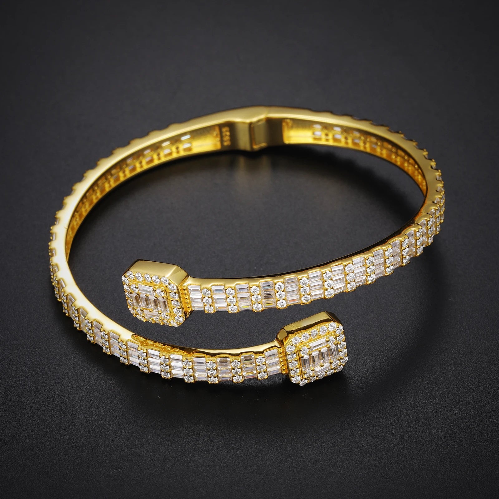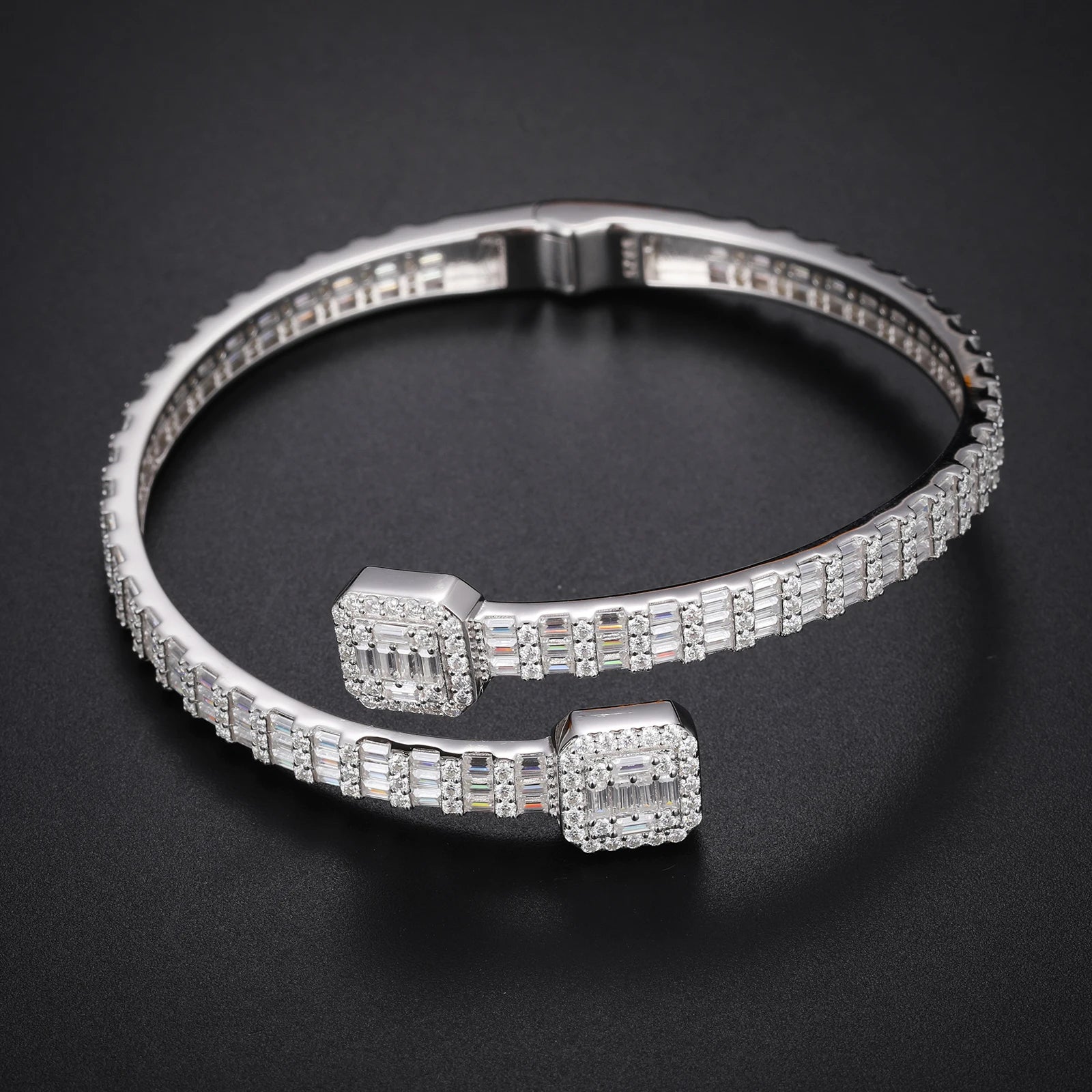 - Luxurious 925 sterling silver cuff featuring a dazzling Moissanite baguette stone, delivering a high-end, unisex hip hop aesthetic that pairs with everything from streetwear to formal attire.