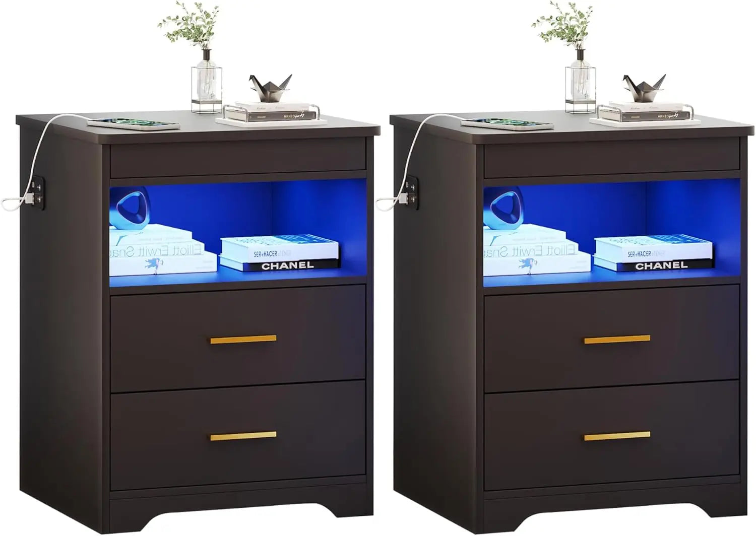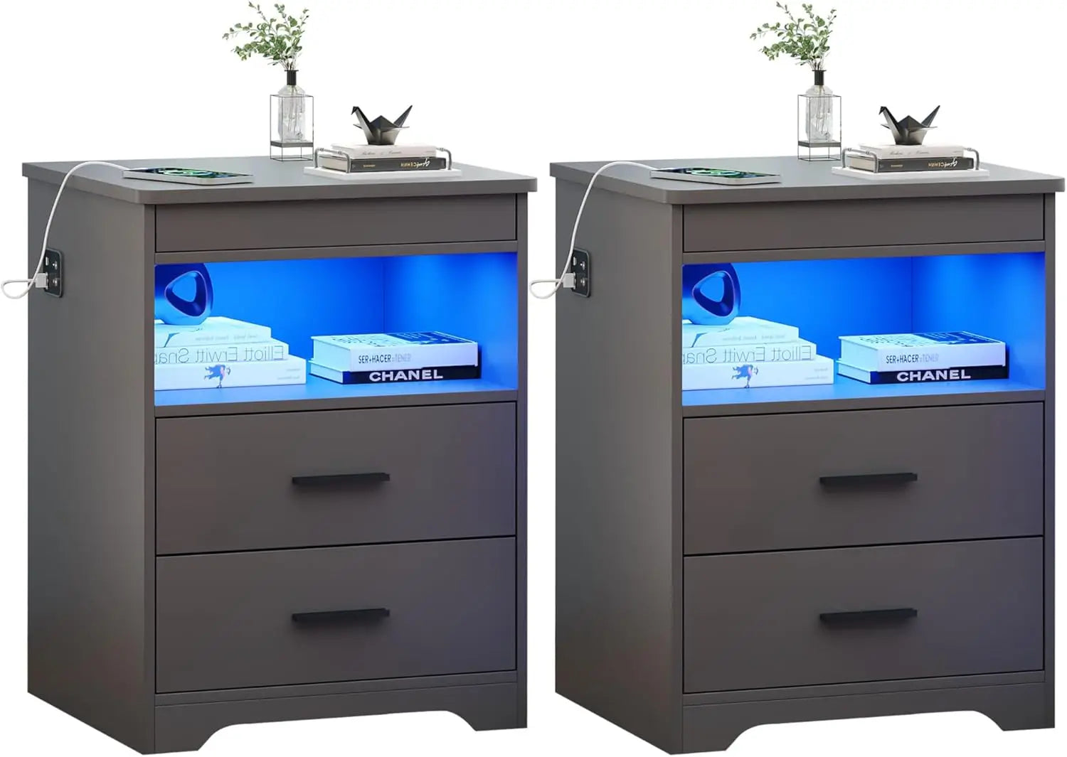 Night Stand Set of 2 Charging Bedside Table with USB and Type C Port LED Night Stand with Human Sensor Light and Gun Drawers