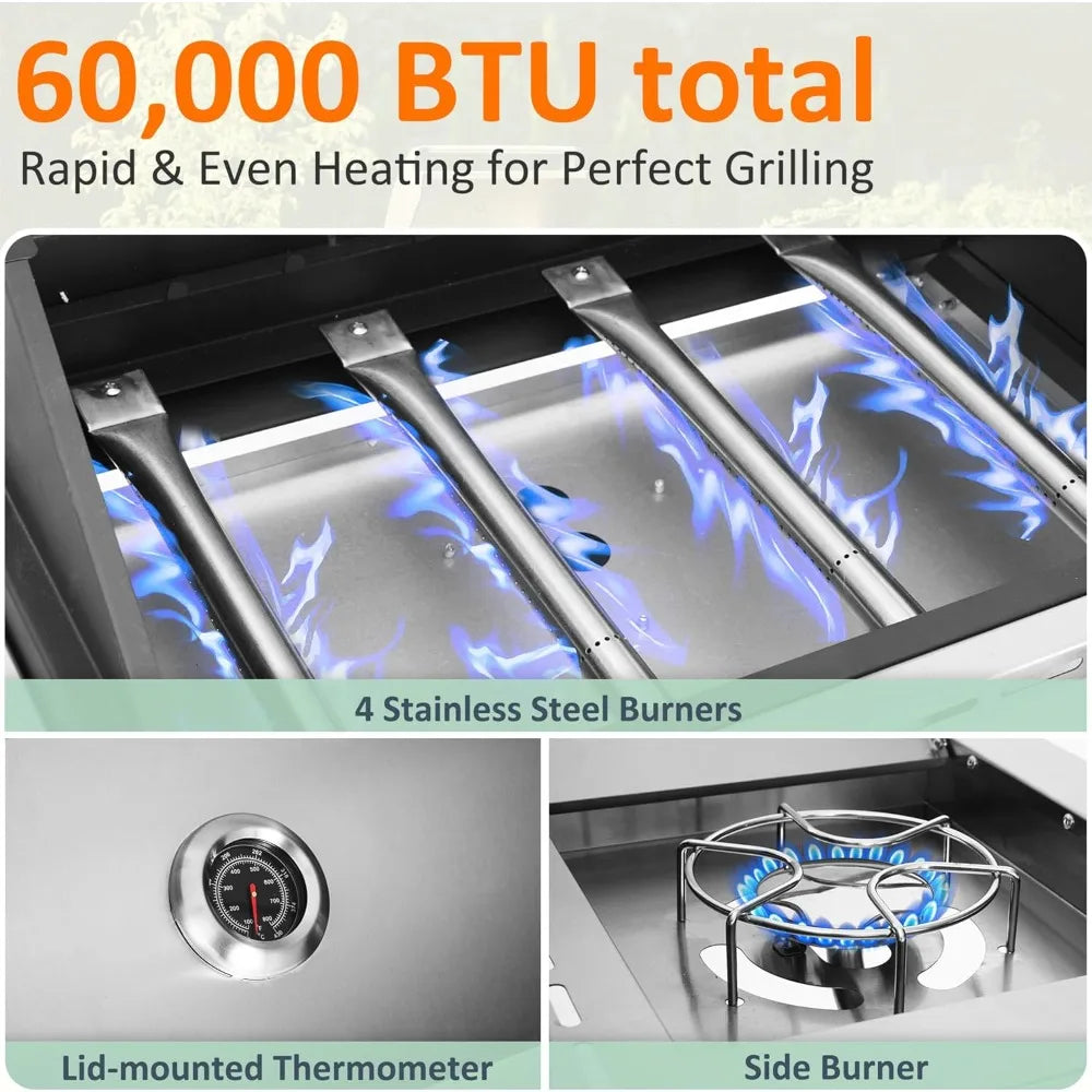 propane gas grill 4 burners with side burner, stainless steel grill cart with wheels for outdoor patio garden backyard cooking