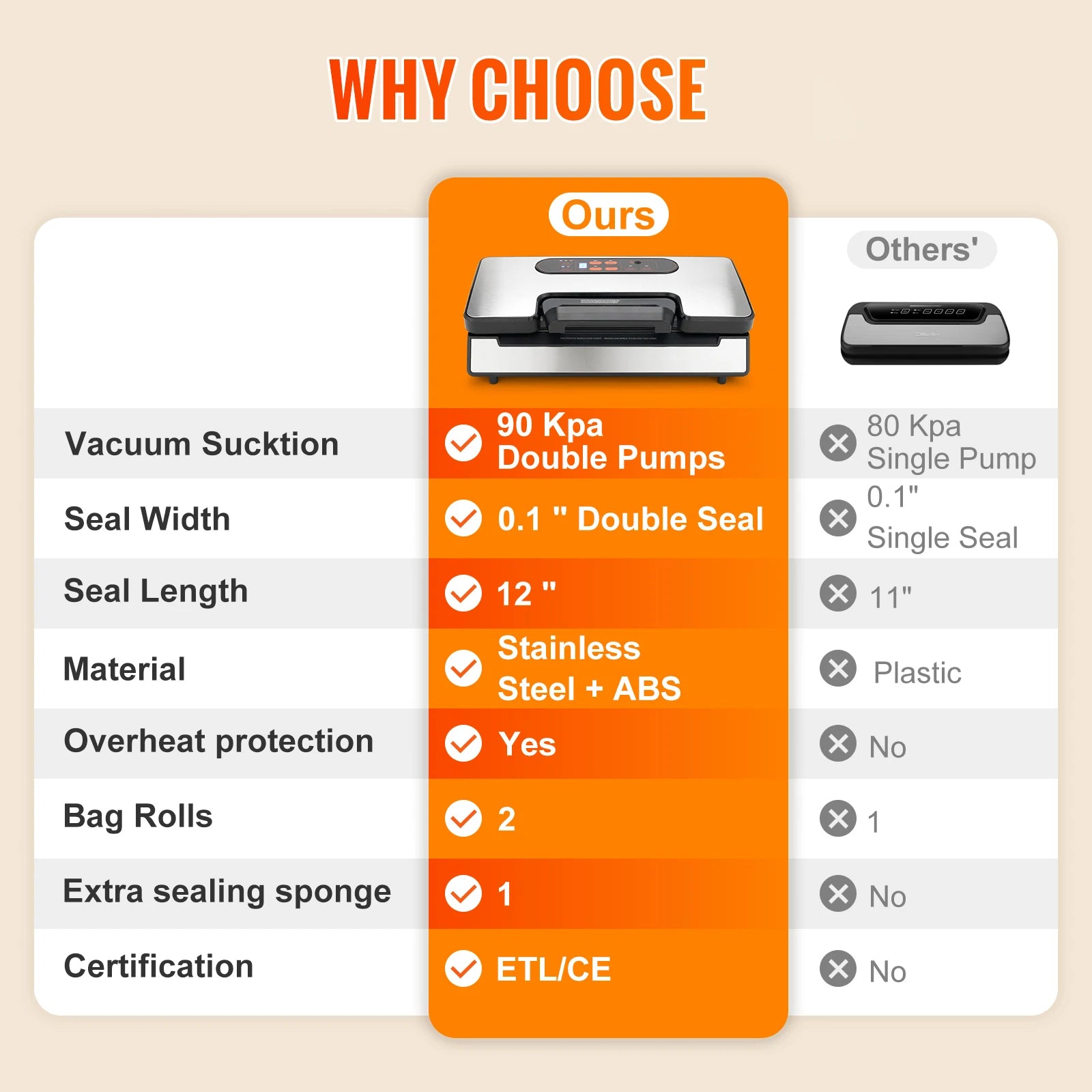 - 90KPa vacuum power delivers tight, airtight seals to lock in flavors and extend freshness for meats, produce, and leftovers.