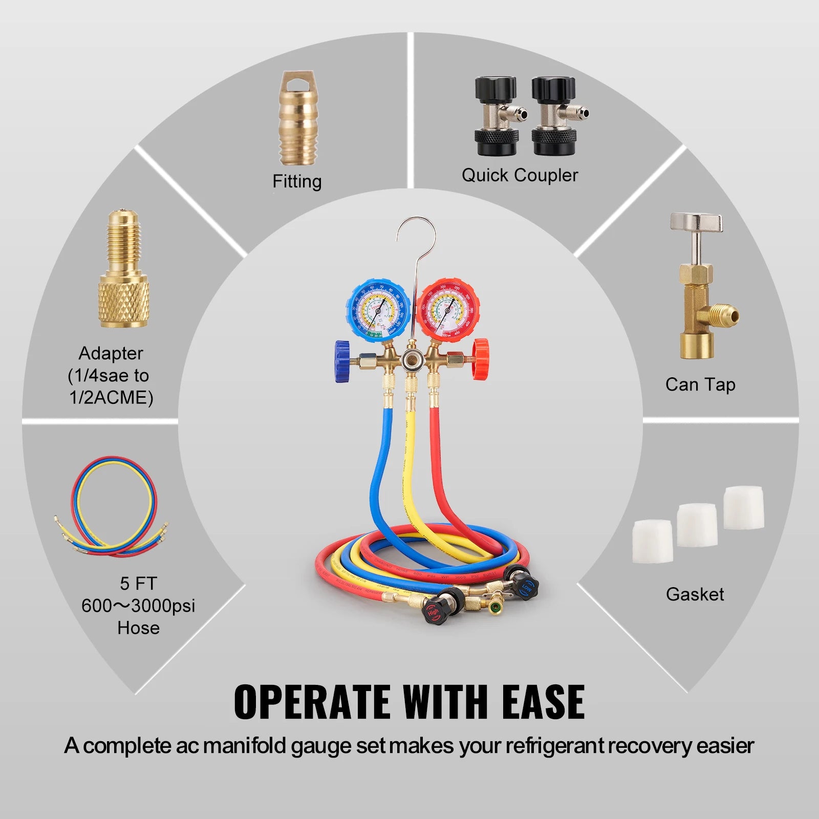 What you get: 3-way manifold, dual high/low gauges, three color-coded hoses with fittings, and reliable operation straight from the box—assembled and performance-checked by Buy Ideal Co.